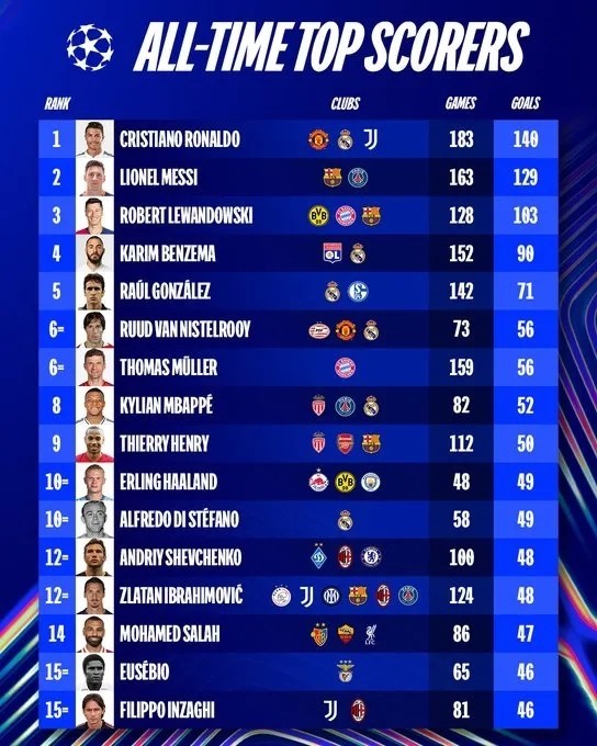 C罗居首!欧冠历史总进球榜:梅西第二,姆巴佩、哈兰德在列!